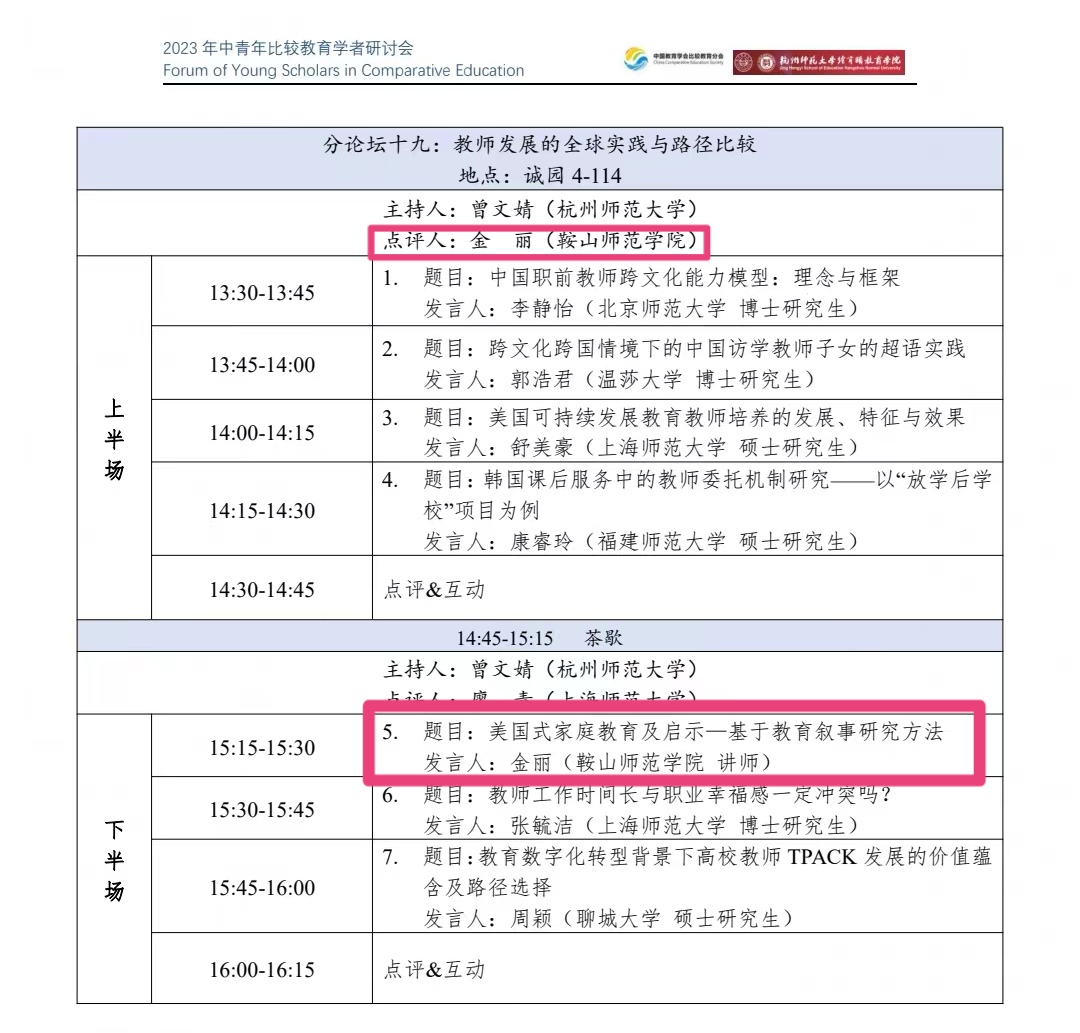 2023年5月13-14日,中国教育学会比较教育分会举办的“2023年中青年比较教育学者研讨会”在杭州师范大学召开。教育科学与技术学院副院长金丽参会并在分论坛中做点评发言。