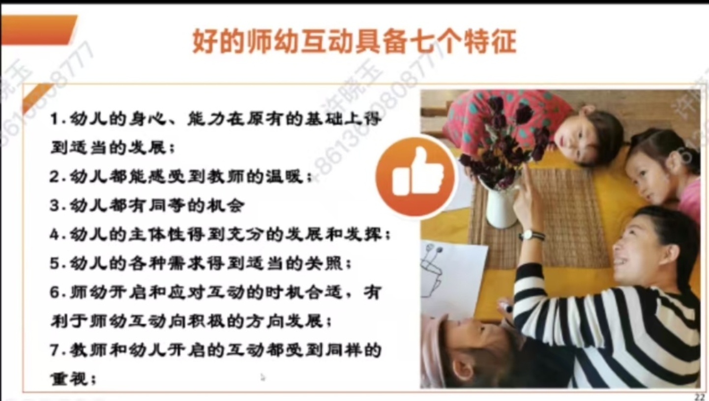 魏主任首先从师幼互动的含义、类型、内容、特点这些方面做了详细的讲解,接着分别对《幼儿园教育指导纲要(试行)》、《3-6岁儿童学习与发展指南》中师幼互动的要求进行了原文表述和解读。魏主任特别指出,根据《幼儿园保育教育质量评估指南》中提出的师幼互动关键指标,幼儿园教师在工作中有七项要求:即情绪积极——尊重与接纳;支持选择——信任并赋权;观察记录——读懂再支持;重视表征——理解幼儿;生成活动——科学看待学习;回应拓展——支持幼儿;尊重差异——因材施教。最后,魏主任列举了大量实例,深入浅出地讲解了提高师幼互动质量的策略,即遵循“四动”原则,提高师幼互动的意识和广度;情感交流,让互动更有温度;提高自身素养,把握师幼互动的技巧。