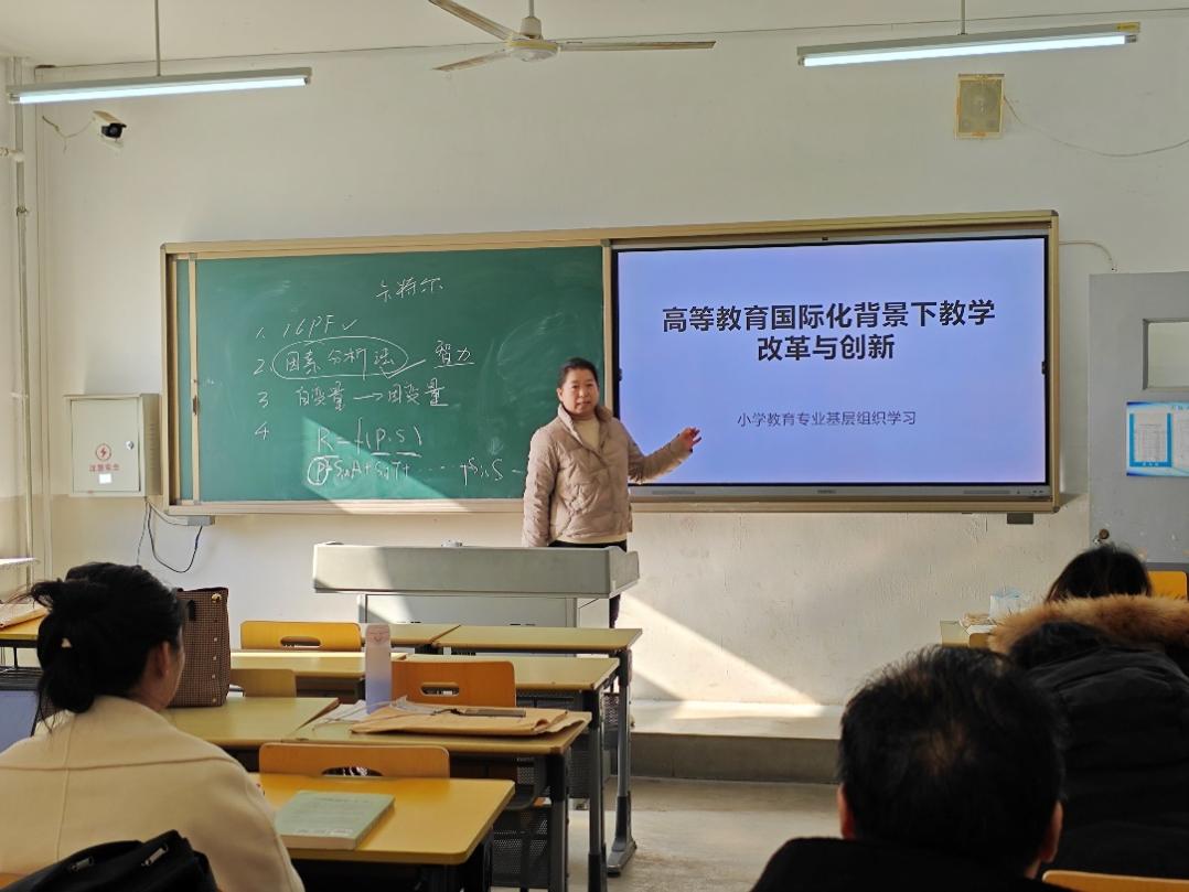 近日,教科院小学教育专业开展“高等教育国际化背景下教学改革与创新”基层教学组织学习。本次学习由刘艳明老师主持,黄玉荣、赵秋、刘艳明老师担任主要发言人。小学教育专业全体教师参加学习。