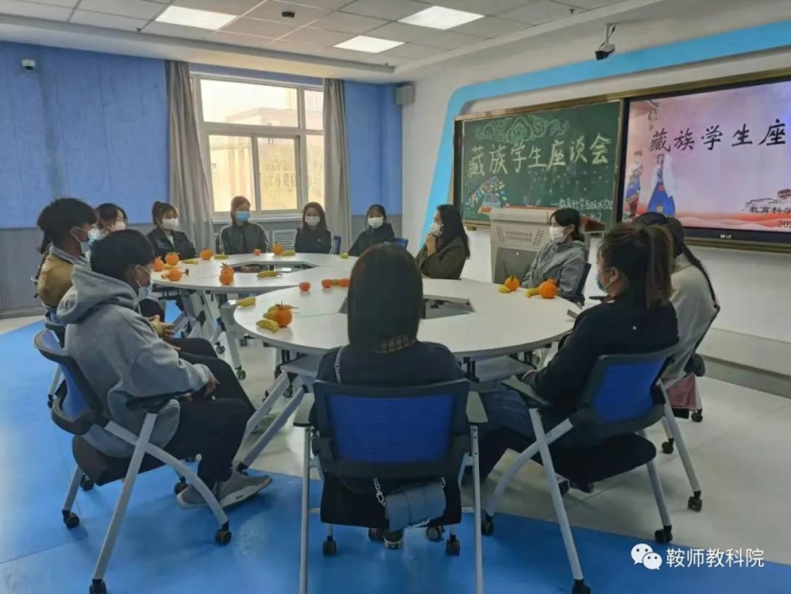 座谈会伊始,徐老师与藏族学子关于家乡文化进行了交流,表达了自己对西藏风景的喜爱与向往,为同学们发放水果后,座谈会在一片温馨融洽中拉开序幕。徐老师询问藏族学生在校生活学习方面是否存在困难,鼓励学生畅所欲言,并逐一慰问了同学们来到鞍师的感受。同学们踊跃发言,将自己的家乡特色,风土人情以及自己对学校的生活感受娓娓道来。大家对在校生活十分满意,话语间还谈到了西藏地区的气候水土和特色食物如糌粑、酥油茶、藏面以及当地的水果。