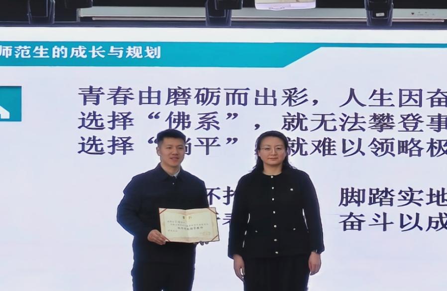 讲座结束后,学院领导为丁超校友颁发了“校外实践指导教师”和“校外辅导员”的聘任书。丁超校友从深耕基层教育的奋斗者,转身成为师范生成长路上的引路人。他二十余年的教学管理智慧与躬身实践的治学精神,将通过课堂指导、教案研讨、实习督导等形式,倾力搭建“学以致用”的实践平台,帮助学子实现从“合格学生”到“卓越教师”的蜕变。丁超校友的加入是推动教学与实践深度融合的重要举措,将助力师范生在真实教育场景中锤炼“站稳讲台”的能力。