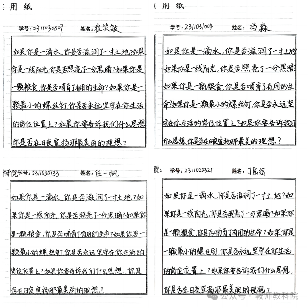 同学们踊跃参加“书写雷锋经典语录”书法活动,通过硬笔书法、软笔书法或粉笔字等形式,书写雷锋日记、雷锋事迹等,创作出以雷锋经典语录为主题的作品。一幅幅精美的作品背后,呈现出的是思想的律动、艺术的境界,这不仅是一场书法技艺的展示,更是一次心灵的洗礼和思想的交流,让学生在艺术创作中深入理解雷锋精神。