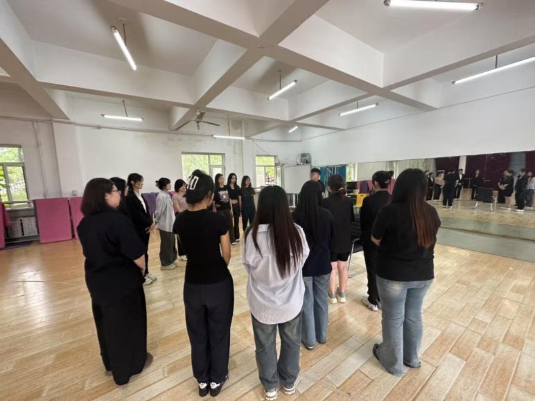 形体训练:王麓雯负责形体训练。她从基本体态训练开始,要求成员保持良好姿势。通过舞蹈元素训练成员柔韧性、协调性和节奏感。在情景表演中,成员运用形体技巧展现角色特点和情绪变化。