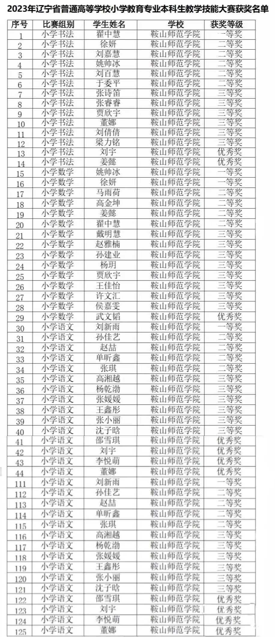 10月21日,由辽宁省教育厅主办的2023年辽宁省普通高等学校小学教育专业本科生教学技能大赛在大连大学圆满落幕。本次大赛,共有来自省内7所师范院校184名小学教育专业选手参加角逐。最终,我校教育科学与技术学院小学教育专业选派的13名选手,在小学数学、小学语文、小学书法三个组别共获一等奖4个、二等奖13个、三等奖20个、优秀奖7个。其中,姚帅冰、徐妍同学获得小学数学组一等奖,刘新雨同学获得小学语文组一等奖,翟中慧同学获得小学书法组一等奖。教科院小学教育专业负责人侯宪胜老师获得组织工作先进个人。教科院侯宪胜老师、李双老师、孙秀鸿老师获得优秀指导教师。德赢vwin8868官网获得优秀组织单位。