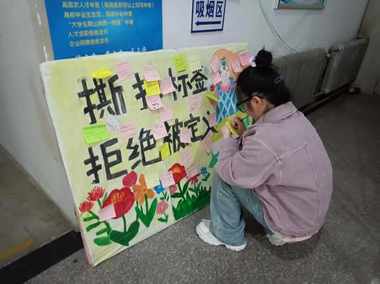 结合现在的热点话题,给他人“帖标题”已经成为当今社会的一个普遍现象,但是这往往伴随着消极的刻板印象,被标签化束缚等现象,我院结合应用心理学专业特色,5月19日举行了“撕掉标签,拒绝被定义”活动,在活动中,同学们打破外界对自己的传统定义、不平等评价和性别刻板印象,撕下原有标签,写下自己看法,使同学们能够重新认识评价自我,远离焦虑,勇敢做自己,领会生命的价值和意义,活出属于自己的人生。
