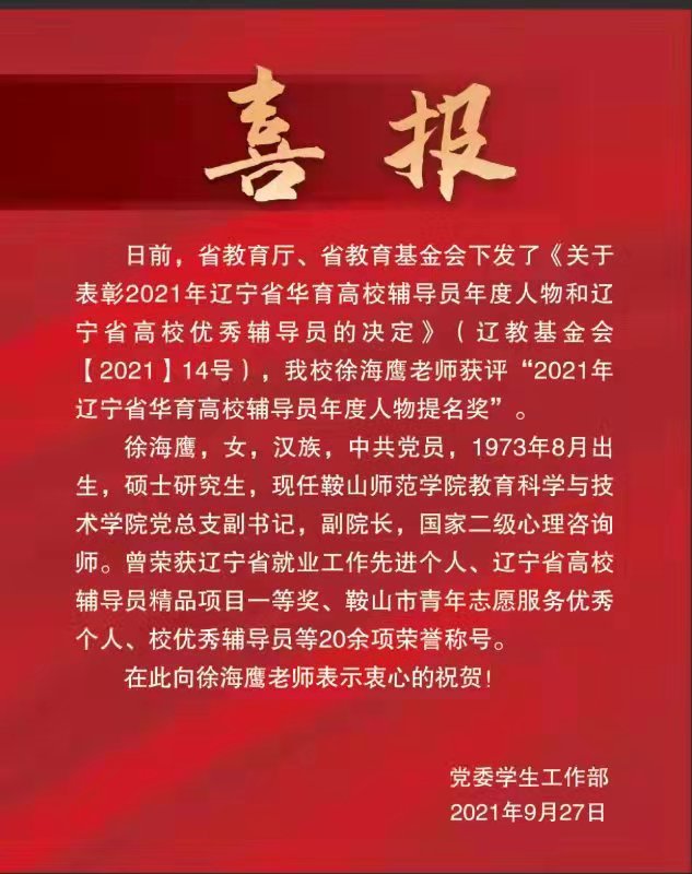 目前,省教育厅、省教育基金会下发了《关于表彰2021年辽宁省华育高校辅导员年度人物和辽宁省高校优秀辅导员的决定》(辽教基金会【2021】14号),我校徐海鹰老师获评“2021年辽宁省华育高校辅导员年度人物提名奖”。