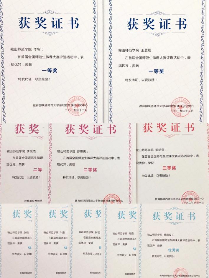 4.在2019年指导学生于首届全国师范生微课大赛评选活动荣获一等奖、二等奖和优秀奖。