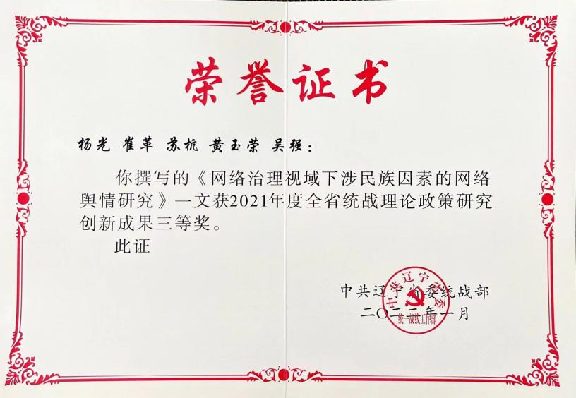 7.在2022年2021年度全省统战理论政策研究创新成果荣获三等奖。