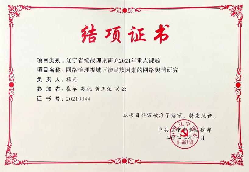 1.在2022年辽宁省统战理论研究2021年重点课题通过结项。