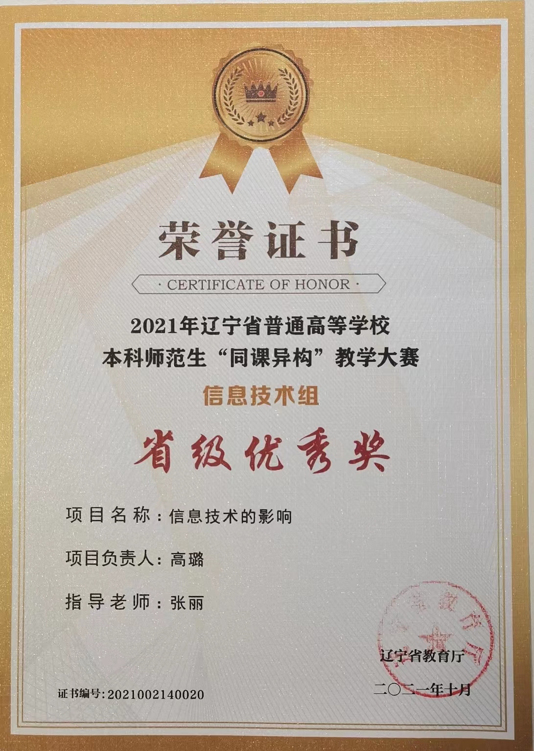 3.在2021年辽宁省普通高等学校本科师范生“同课异构”教学大赛中荣获省级优秀奖。