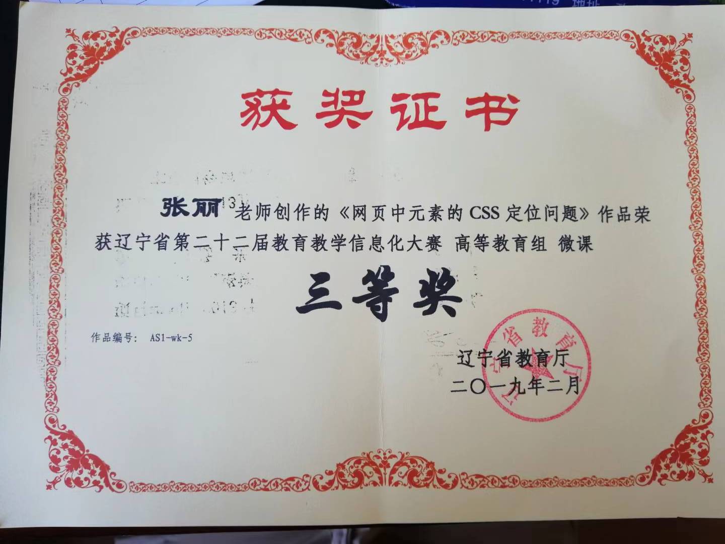1.在2019年辽宁省第二十二届教育教学信息化大赛高等教育组微课荣获三等奖。