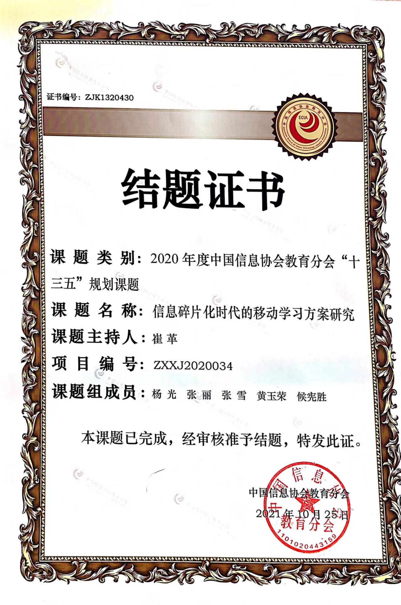2.在2021年通过2020年度中国信息协会教育分会“十三五”规划课题结题。