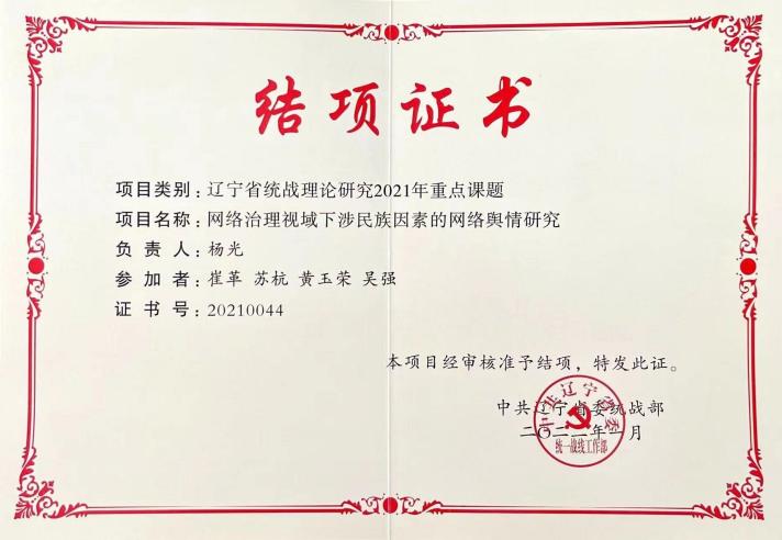 1.在2022年通过辽宁省统战理论研究2021年重点课题。