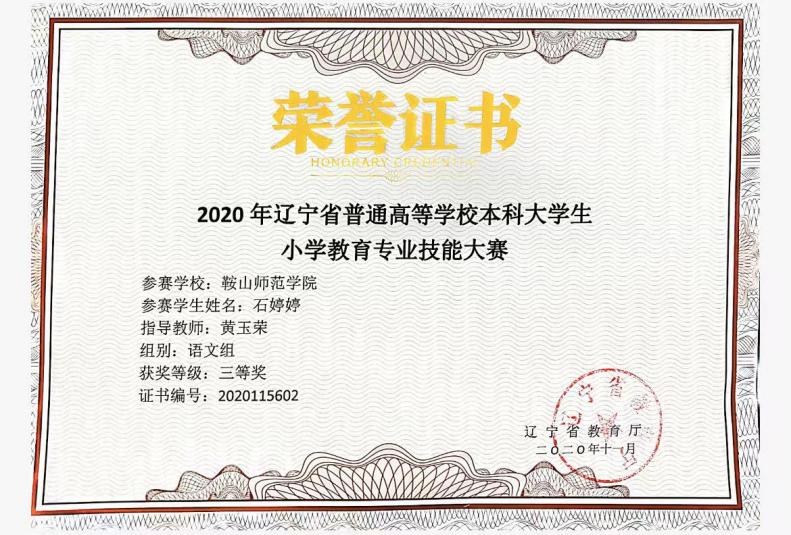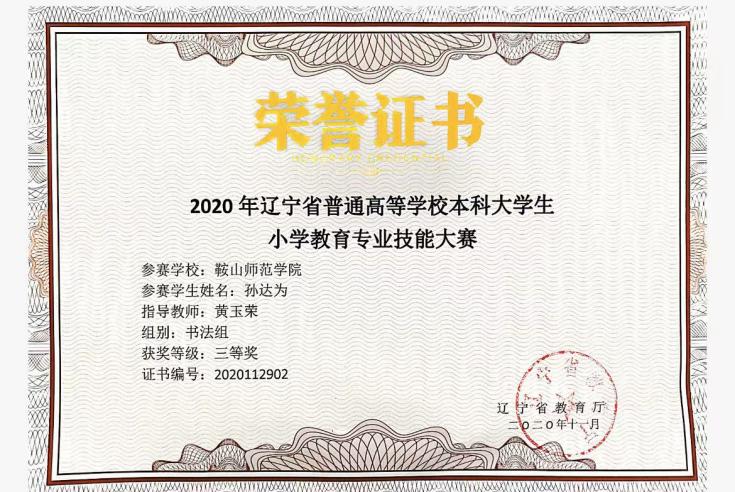 6.在2020年指导学生在辽宁省普通高等学校本科大学生小学教育专业技能大赛荣获三等奖。