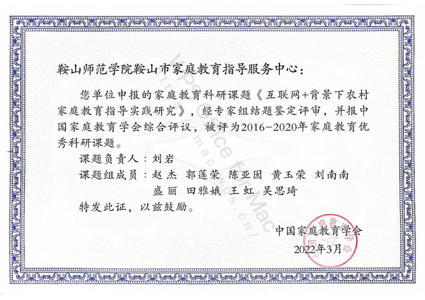 3.在2019年辽宁省“十三五”家庭教育科研课题荣获三等奖。